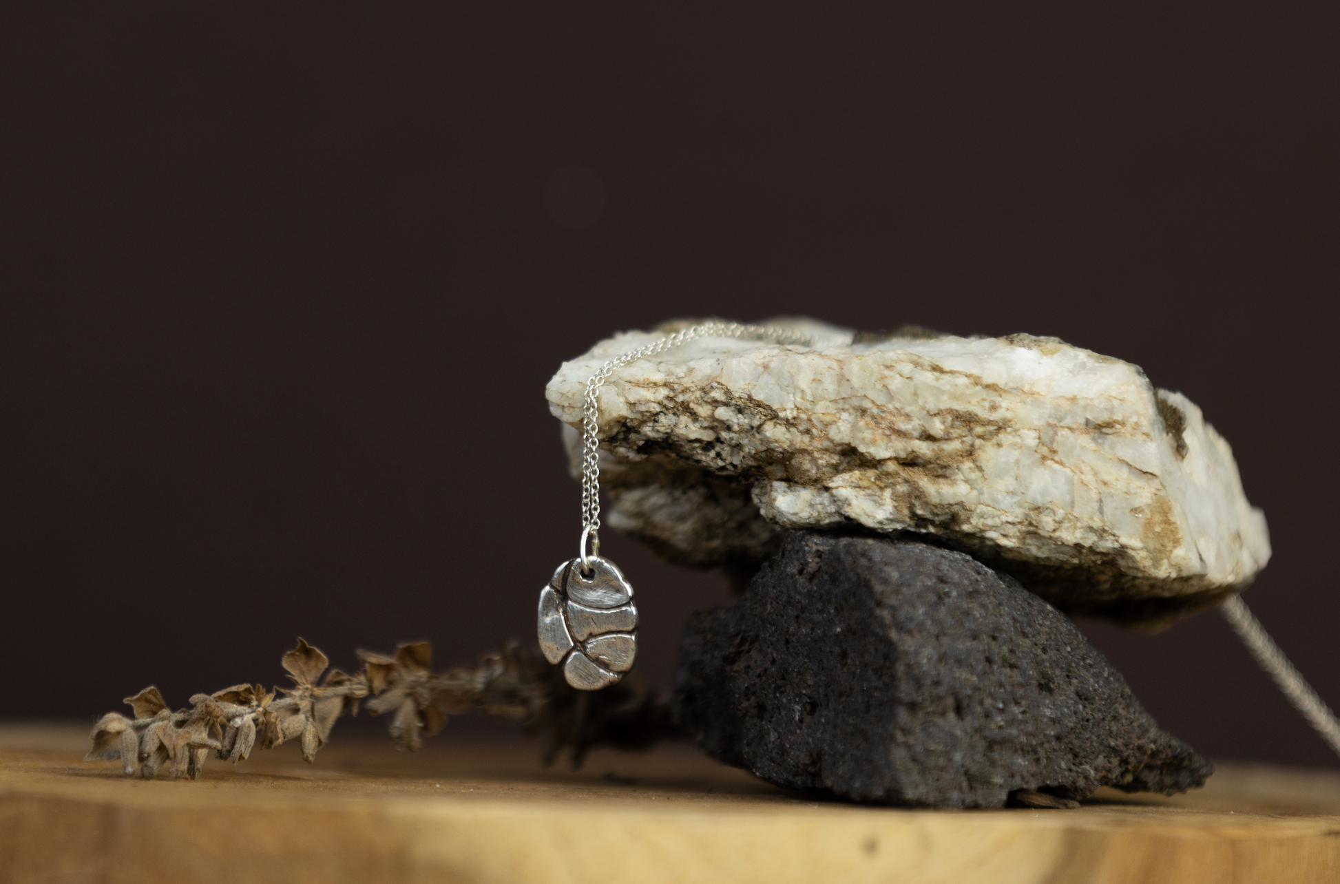 This is one of our abstract pendant necklaces. The design was sketched out on silver clay and is composed of overlapping circles. This design is a more oval- shaped thicker piece with a scalloped edge as seen in the pictures.